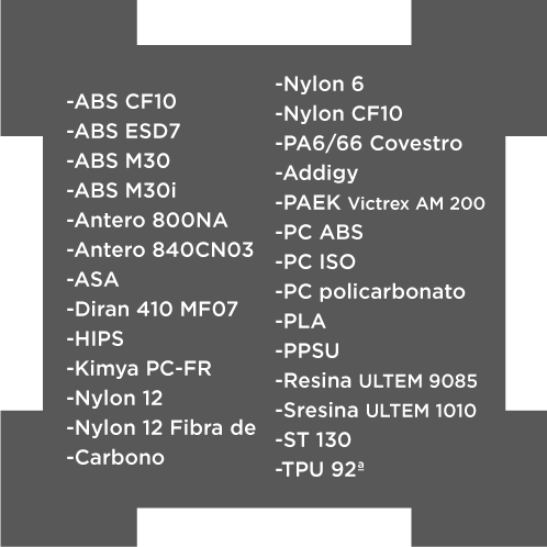 Nos aseguramos de imprimir tus piezas con los equipos de la más alta tecnología y con MÁS DE 42 MATERIALES CERTIFICADOS que nos permiten alcanzar las propiedades mecánicas requeridas para nuestros clientes, además de contar con un gran formato de impresión Hasta ´914 mm × 610 mm × 914 mm´.